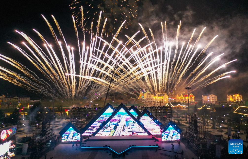 A drone photo taken on Sept. 1, 2023 shows fireworks during a gala of the 2023 China (Arxan) Tourism Conference in Arxan of Hinggan League, north China's Inner Mongolia Autonomous Region. (Xinhua/Lian Zhen)