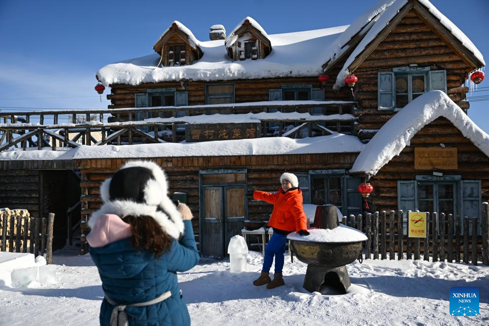 Visitors take photos in Arxan of Hinggan League, north China's Inner Mongolia Autonomous Region, Dec. 14, 2023. (Xinhua/Bei He)