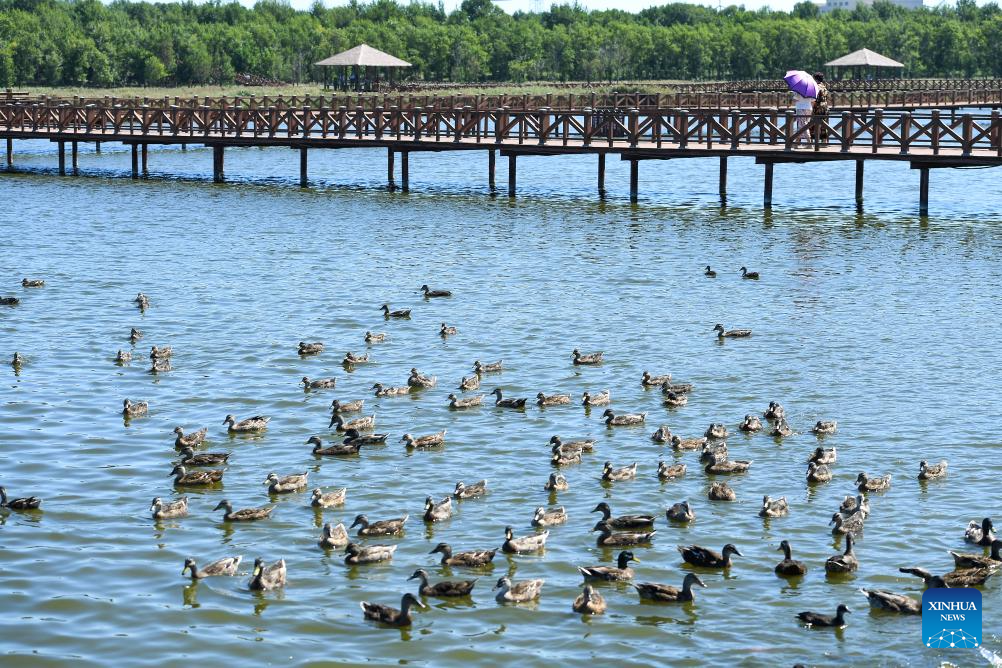 Wild ducks swim in the Chagan Lake National Nature Reserve in Songyuan City, northeast China's Jilin Province, Aug. 26, 2024. (Xinhua/Zhang Nan)