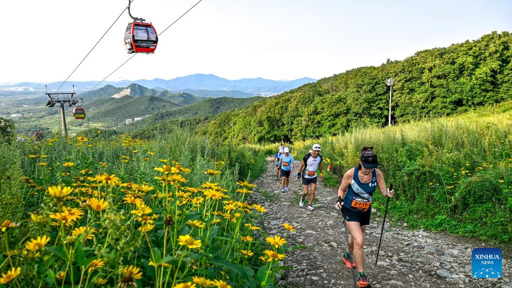 People participate in a trail running at Lake Songhua Resort in Jilin City, northeast China's Jilin Province, Aug. 24, 2024. (Xinhua/Yan Linyun)