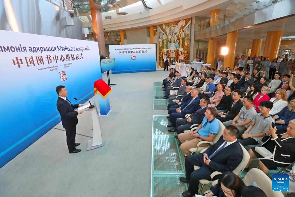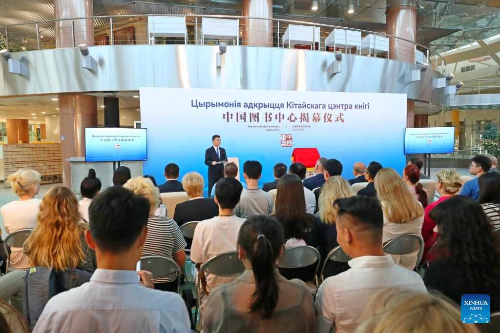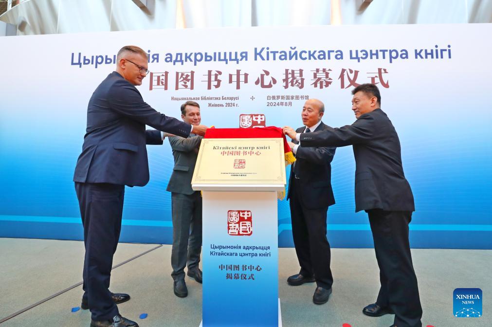 An unveiling ceremony of the Chinese Book Center at the National Library of Belarus is held in Minsk, Belarus, on Aug. 28, 2024. The Chinese Book Center at the National Library of Belarus was established in Minsk on Wednesday. (Photo by Henadz Zhinkov/Xinhua)