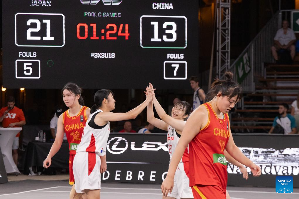 Players (C) of Japan celebrate during the women's Pool C match between Japan and China at the FIBA 3x3 U18 World Cup in Debrecen, Hungary on Aug. 28, 2024. (Photo by Attila Volgyi/Xinhua)