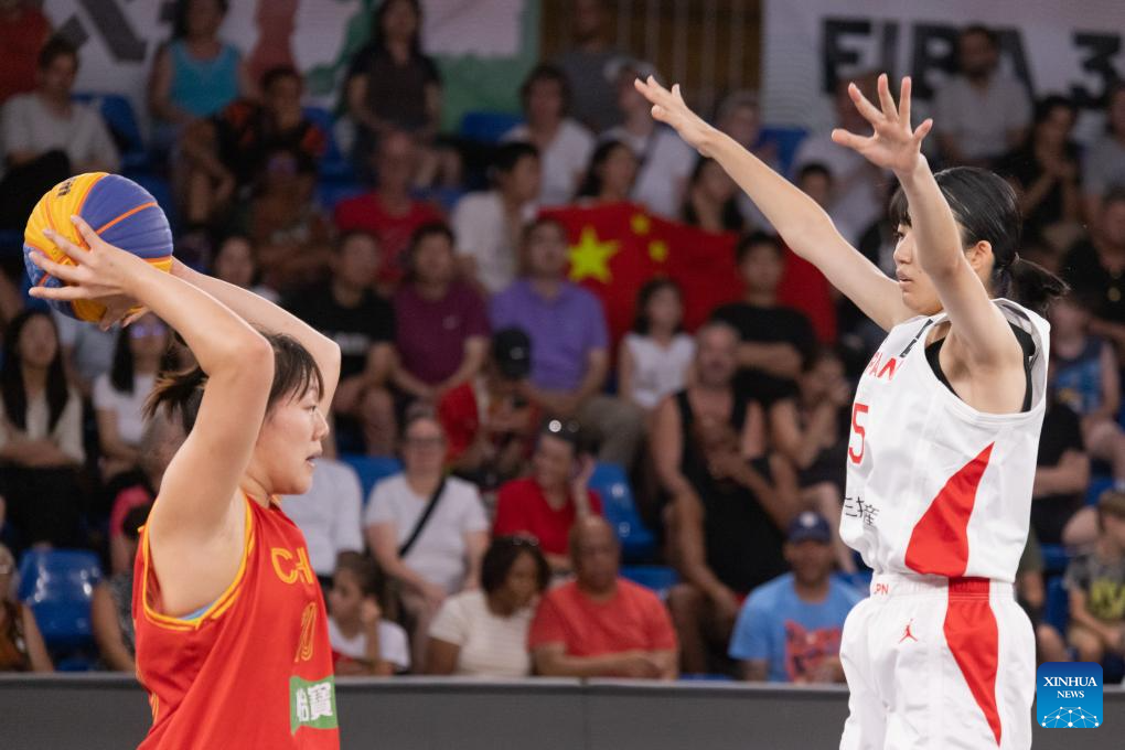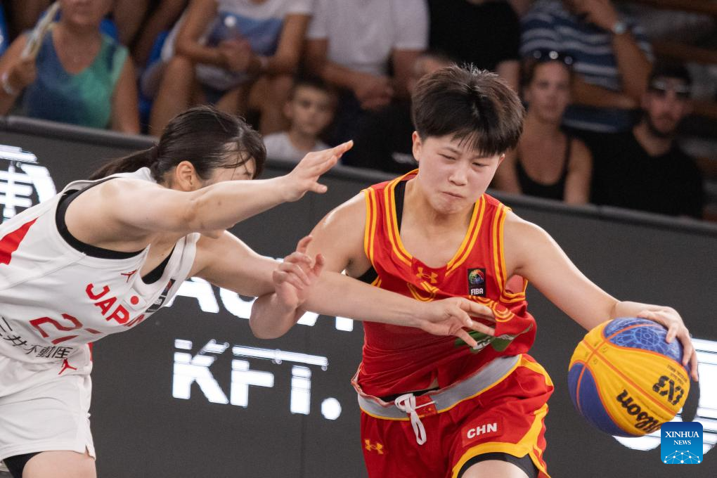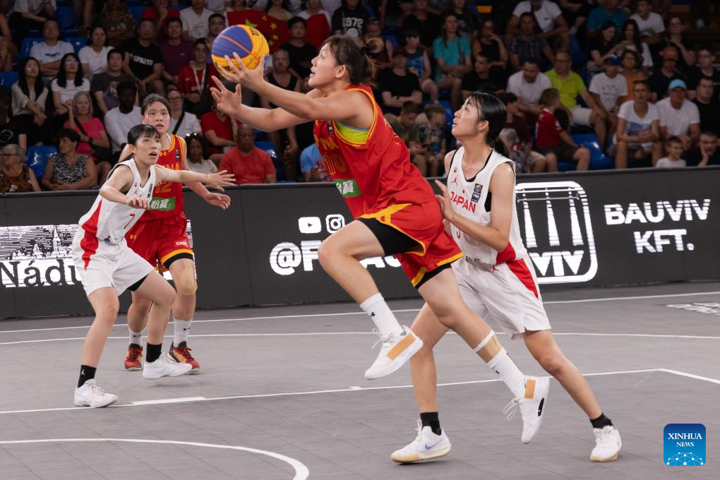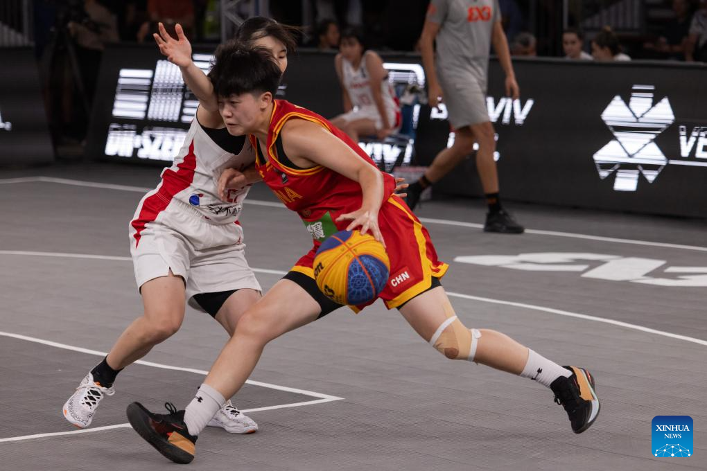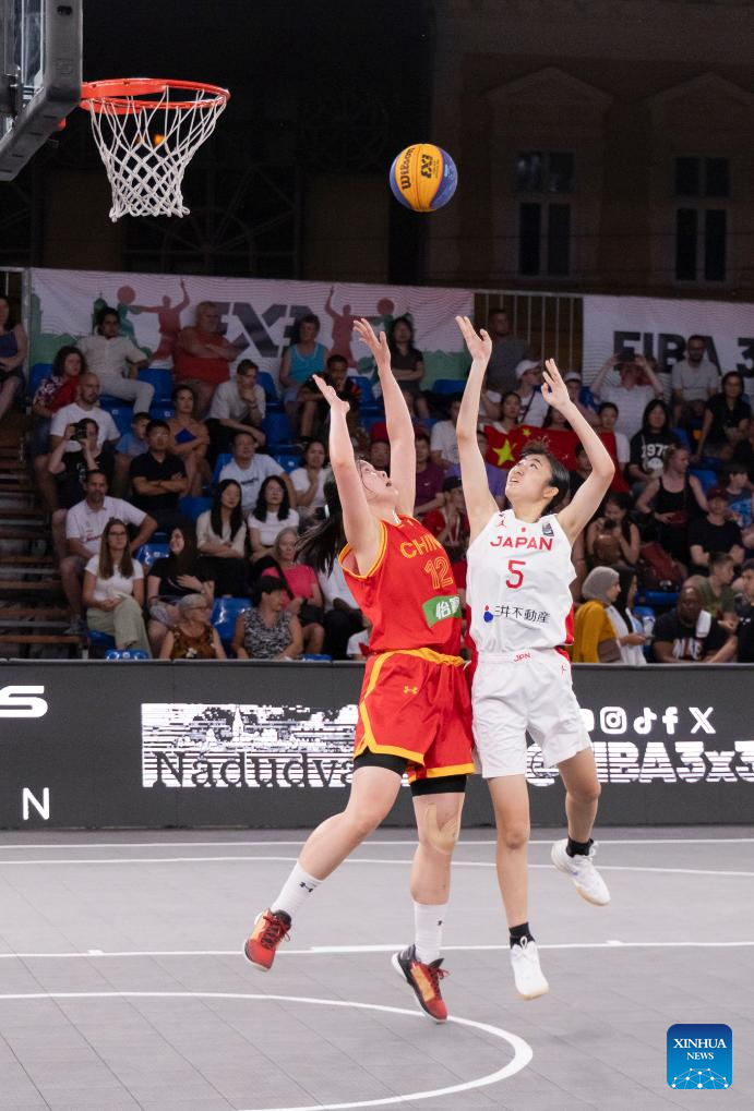 Liu Xiaohan (2nd R) of China goes for a basket during the women's Pool C match between Japan and China at the FIBA 3x3 U18 World Cup in Debrecen, Hungary on Aug. 28, 2024. (Photo by Attila Volgyi/Xinhua)