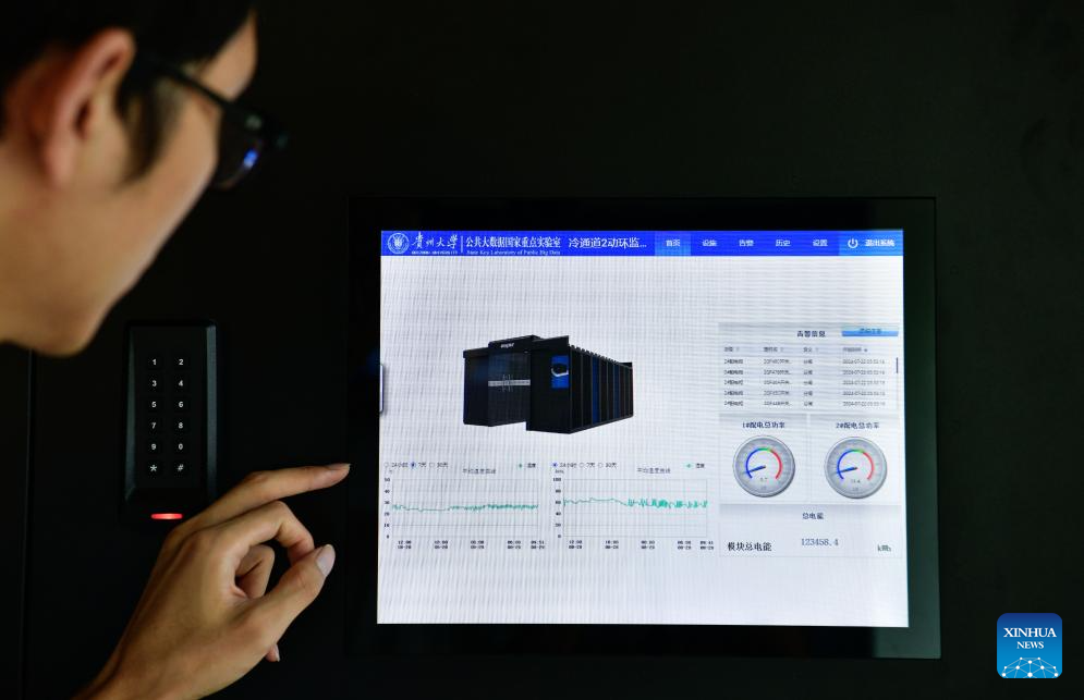 A staff member checks the operation of a monitoring system at the State Key Laboratory of Public Big Data at Guizhou University in Guiyang, southwest China's Guizhou Province, Aug. 29, 2024. As the first of its kind in the field of big data in the country, Guizhou University's State Key Laboratory of Public Big Data has three stable research directions, including multi-source data fusion and integration technology, public big data security and privacy protection, block data and regional governance. (Xinhua/Yang Wenbin)