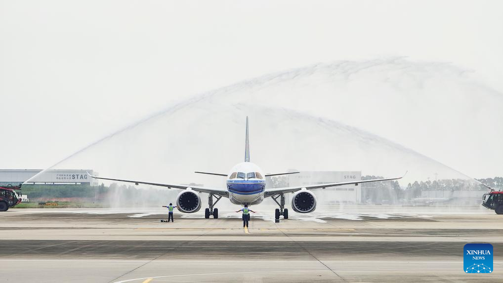 The first C919 aircraft of China Southern Airlines arrives at Guangzhou Baiyun International Airport in Guangzhou, south China's Guangdong Province, Aug. 29, 2024. (Xinhua/Tian Jianchuan)