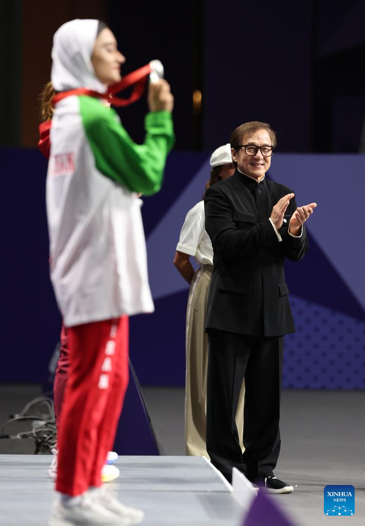 Actor Jackie Chan (R) attends the awarding ceremony after the women K44 -52kg gold medal contest of para taekwondo at the Paris 2024 Paralympic Games in Paris, France, Aug. 29, 2024. (Xinhua/Hou Jun)