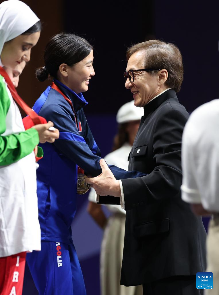 Actor Jackie Chan (R) and gold medalist Surenjav Ulambayar (C) of Mongolia react during the awarding ceremony after the women K44 -52kg gold medal contest of para taekwondo at the Paris 2024 Paralympic Games in Paris, France, Aug. 29, 2024. (Xinhua/Hou Jun)