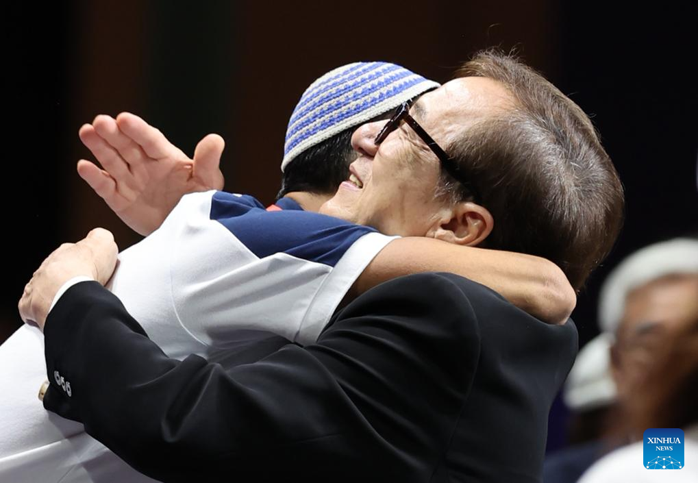 Actor Jackie Chan (R) hugs gold medalist Asaf Yasur of Israel during the awarding ceremony after the men K44 -58kg gold medal contest of para taekwondo at the Paris 2024 Paralympic Games in Paris, France, Aug. 29, 2024. (Xinhua/Hou Jun)