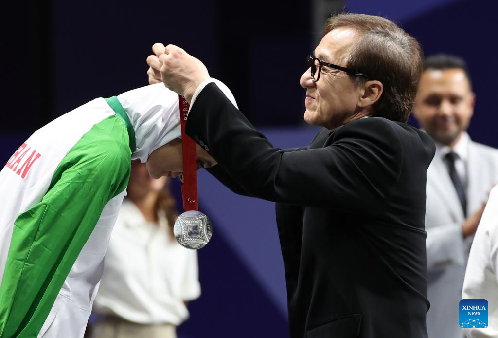 Actor Jackie Chan (R) presents the medal to silver medalist Zahra Rahimi of Iran during the awarding ceremony after the women K44 -52kg gold medal contest of para taekwondo at the Paris 2024 Paralympic Games in Paris, France, Aug. 29, 2024. (Xinhua/Hou Jun)