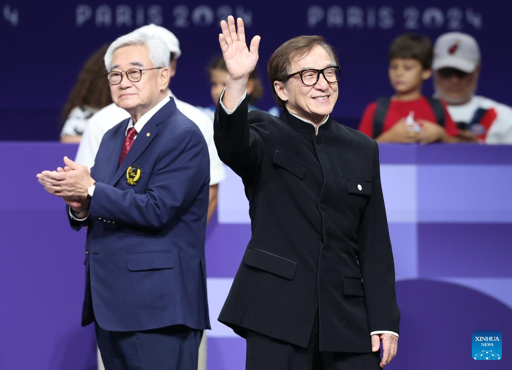 Actor Jackie Chan (R) waves to the spectators during the awarding ceremony after the men K44 -58kg gold medal contest of para taekwondo at the Paris 2024 Paralympic Games in Paris, France, Aug. 29, 2024. (Xinhua/Hou Jun)
