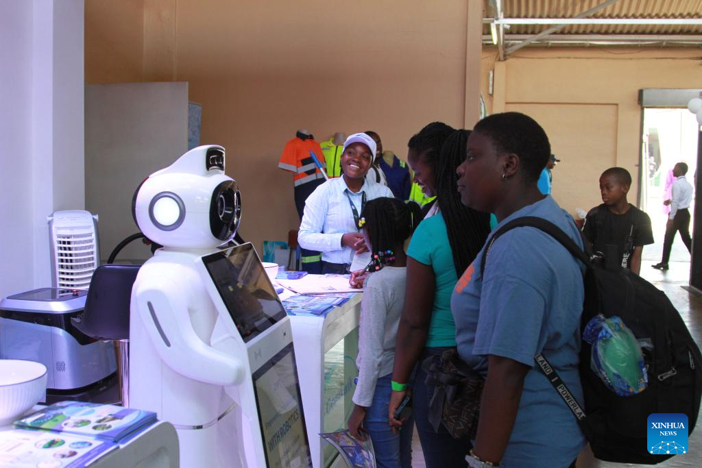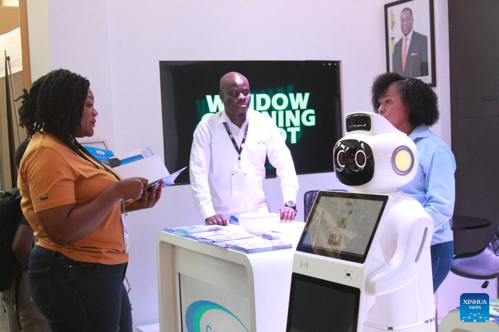 People visit the exhibition stand of Zimbabwean company Comkwik at the Zimbabwe Agricultural Show in Harare, Zimbabwe, on Aug. 30, 2024. Comkwik, a Zimbabwean company, is harnessing the technological innovations in China amid the booming trade relations between China and Zimbabwe to achieve business growth. (Xinhua/Tafara Mugwara)