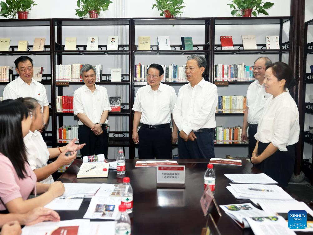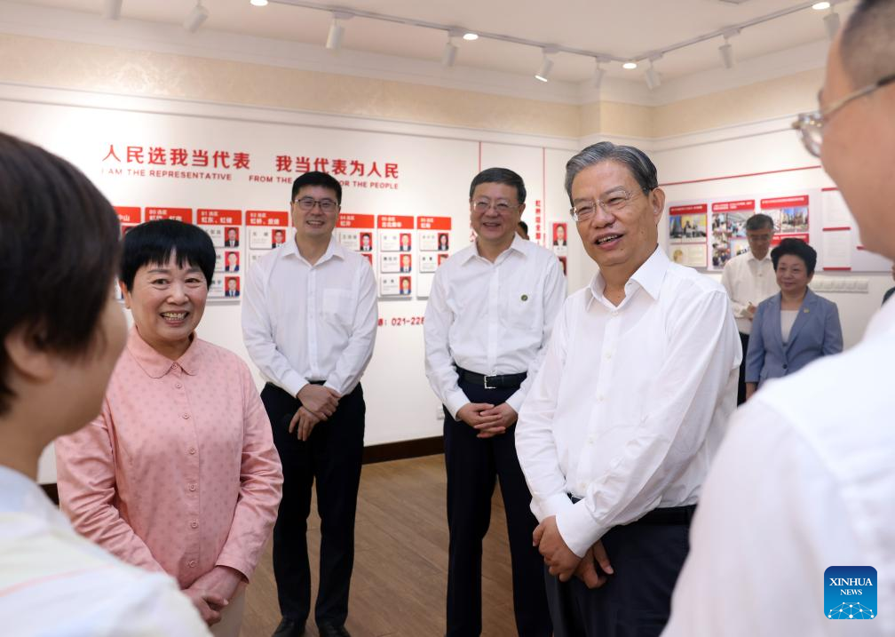 Zhao Leji, a member of the Standing Committee of the Political Bureau of the Communist Party of China Central Committee and chairman of the National People's Congress Standing Committee, visits a practicing center of whole-process people's democracy in Hangzhou, east China's Zhejiang Province, Aug. 28, 2024. Zhao made an inspection tour in east China's Zhejiang Province and Shanghai Municipality that began on Wednesday and ended on Friday. (Xinhua/Liu Weibing)