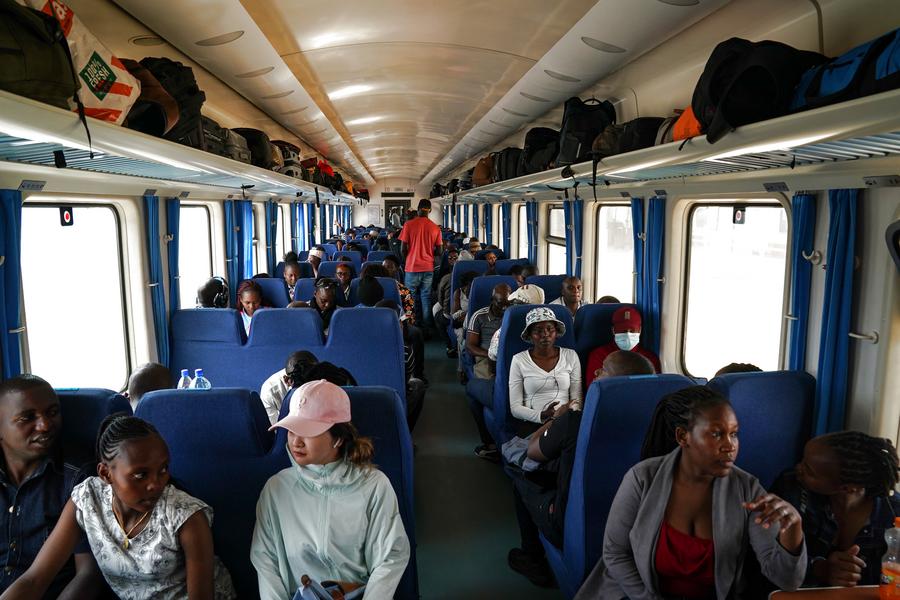Passengers are seen in the train to Mombasa at Nairobi Terminus Station of the China built Mombasa-Nairobi Standard Gauge Railway (SGR) in Nairobi, Kenya, Sept. 20, 2023. (Xinhua/Han Xu)