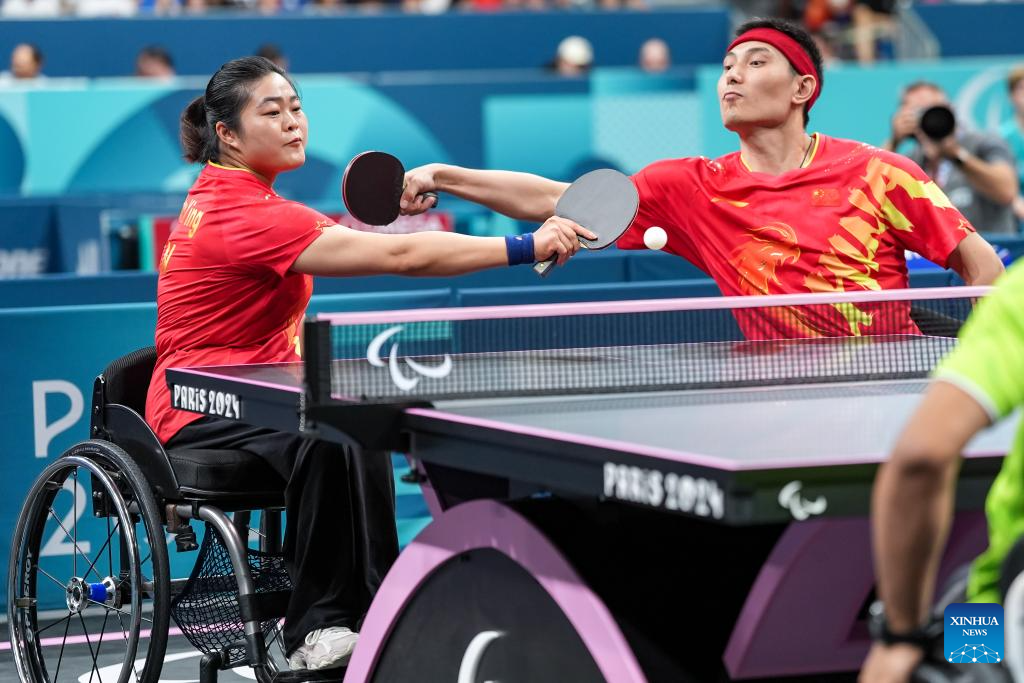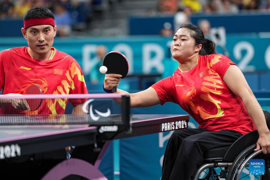 Feng Panfeng/Zhou Ying (R) of China compete during the Para Table Tennis Mixed Doubles XD7 final against Yuttajak Glinbancheun/Wijittra Jaion of Thailand at the Paris 2024 Paralympic Games in Paris, France, Sept. 1, 2024. (Xinhua/Zhang Cheng)