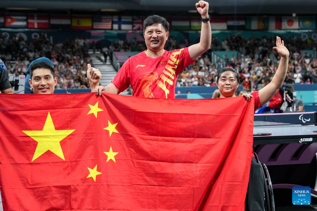 Feng Panfeng (L)/Zhou Ying (R) of China celebrate wtih their coach Heng Xin after winning the Para Table Tennis Mixed Doubles XD7 final against Yuttajak Glinbancheun/Wijittra Jaion of Thailand at the Paris 2024 Paralympic Games in Paris, France, Sept. 1, 2024. (Xinhua/Zhang Cheng)