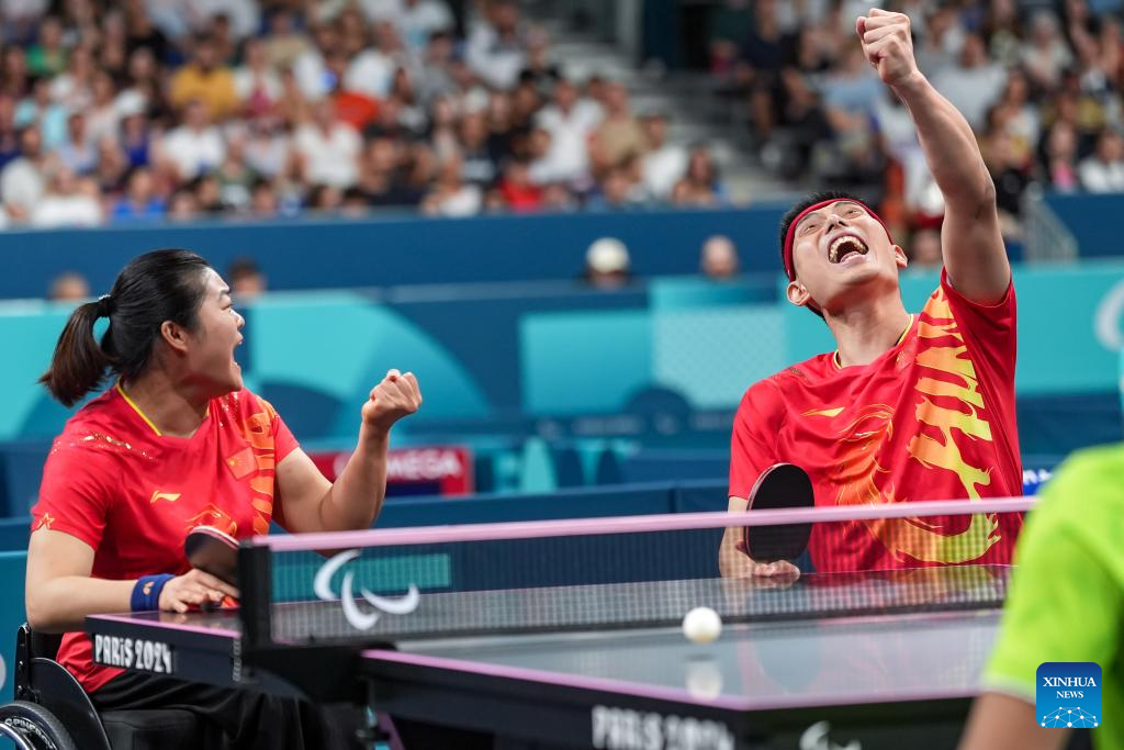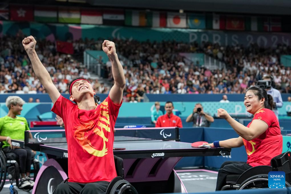 Feng Panfeng (L)/Zhou Ying of China celebrate after winning the Para Table Tennis Mixed Doubles XD7 final against Yuttajak Glinbancheun/Wijittra Jaion of Thailand at the Paris 2024 Paralympic Games in Paris, France, Sept. 1, 2024. (Xinhua/Zhang Cheng)