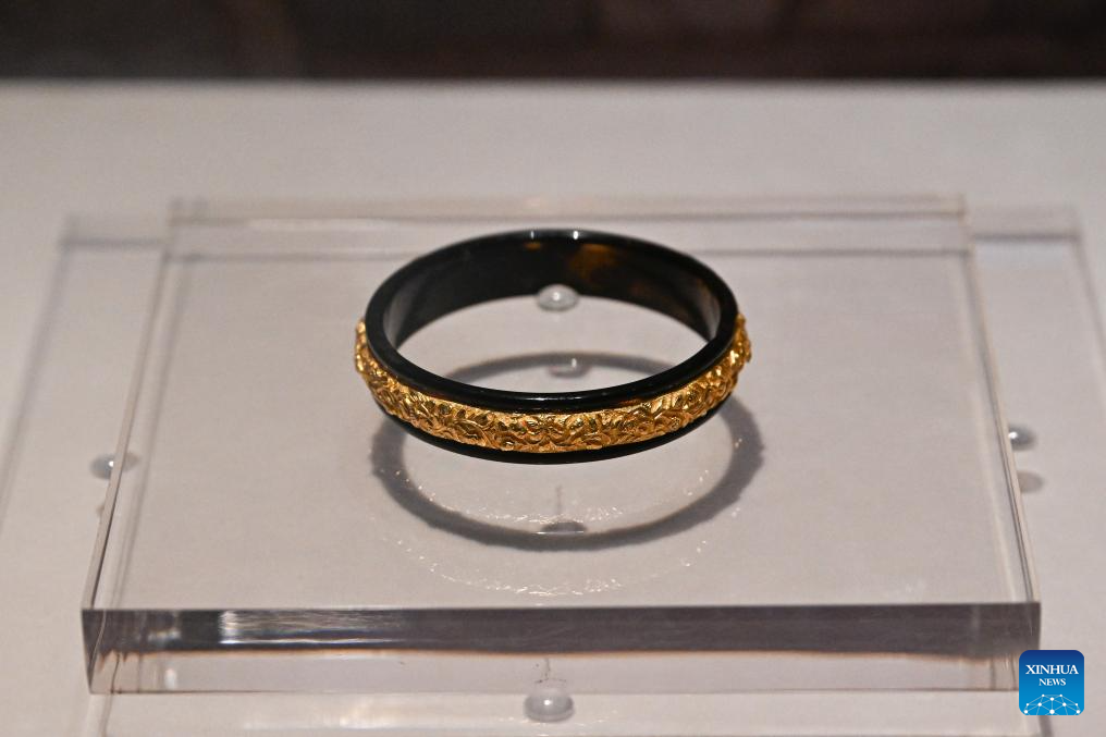 This photo taken on Aug. 31, 2024 shows a golden bracelet of Qing Dynasty (1644-1911) at Hainan Museum in Haikou, south China's Hainan Province. An ongoing exhibition showcasing Hainan's cultural relics collected by the Palace Museum is held at Hainan Museum. A total of 96 exhibits with Hainan characteristics are on display including traditional furniture, ornaments and stationery, etc. (Xinhua/Pu Xiaoxu)