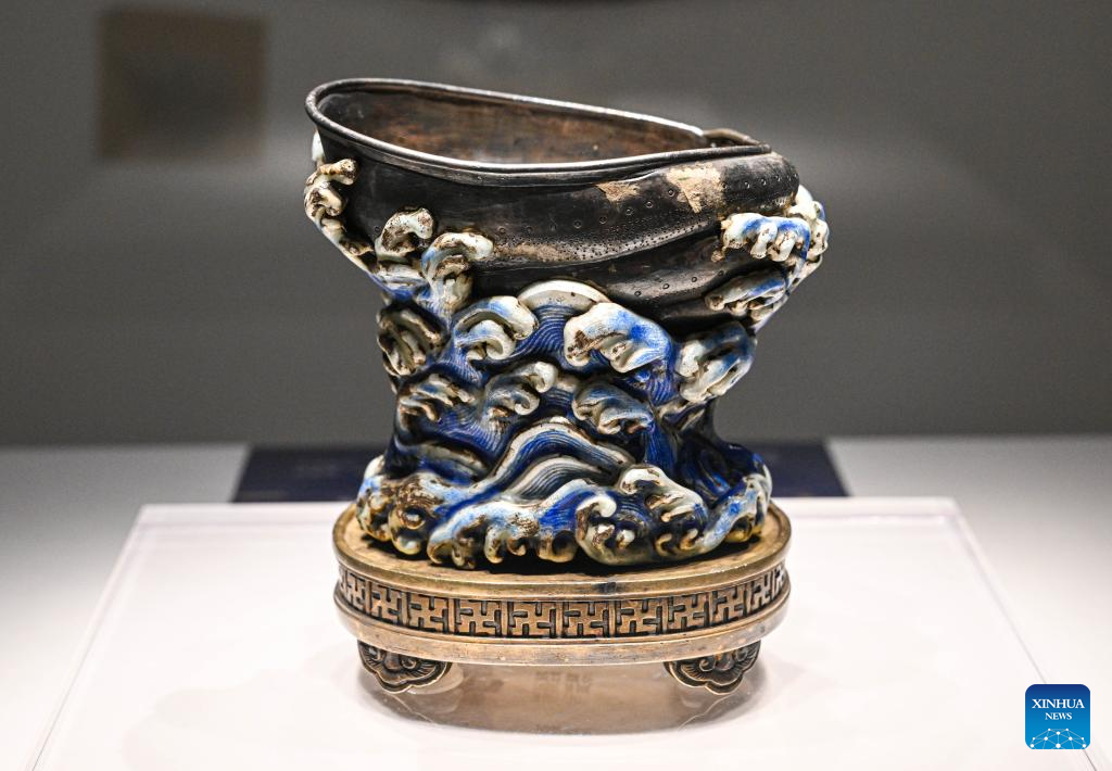 This photo taken on Aug. 31, 2024 shows an exhibit of Qing Dynasty (1644-1911) at Hainan Museum in Haikou, south China's Hainan Province. An ongoing exhibition showcasing Hainan's cultural relics collected by the Palace Museum is held at Hainan Museum. A total of 96 exhibits with Hainan characteristics are on display including traditional furniture, ornaments and stationery, etc. (Xinhua/Pu Xiaoxu)