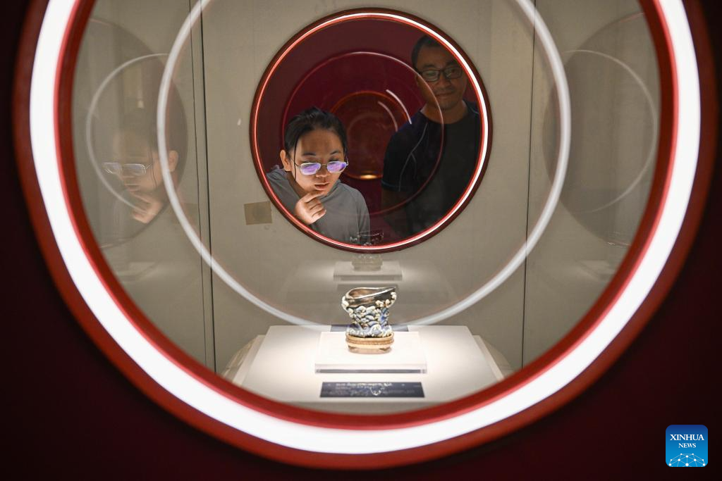 Visitors look at an exhibit on a special exhibition at Hainan Museum in Haikou, south China's Hainan Province, Aug. 31, 2024. An ongoing exhibition showcasing Hainan's cultural relics collected by the Palace Museum is held at Hainan Museum. A total of 96 exhibits with Hainan characteristics are on display including traditional furniture, ornaments and stationery, etc. (Xinhua/Pu Xiaoxu)