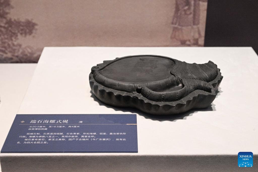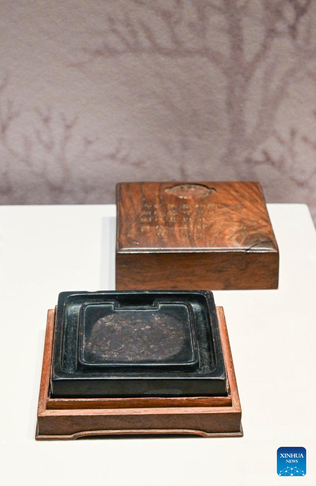 This photo taken on Aug. 31, 2024 shows an inkstone of Qing Dynasty (1644-1911) at Hainan Museum in Haikou, south China's Hainan Province. An ongoing exhibition showcasing Hainan's cultural relics collected by the Palace Museum is held at Hainan Museum. A total of 96 exhibits with Hainan characteristics are on display including traditional furniture, ornaments and stationery, etc. (Xinhua/Pu Xiaoxu)