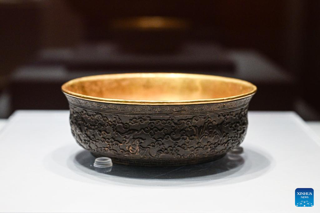 This photo taken on Aug. 31, 2024 shows a bowl made of coconut shell of Qing Dynasty (1644-1911) at Hainan Museum in Haikou, south China's Hainan Province. An ongoing exhibition showcasing Hainan's cultural relics collected by the Palace Museum is held at Hainan Museum. A total of 96 exhibits with Hainan characteristics are on display including traditional furniture, ornaments and stationery, etc. (Xinhua/Pu Xiaoxu)
