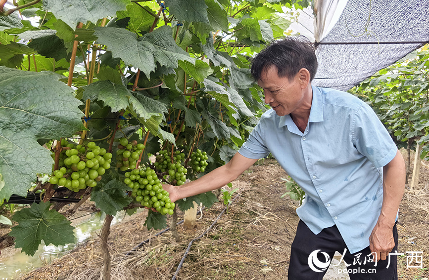 A villager checks on the growth of grapes at his orchard in Gucun village, Wushan township, Xingbin district, Laibin city, south China's Guangxi Zhuang Autonomous Region. (People's Daily Online/Fu Huazhou)