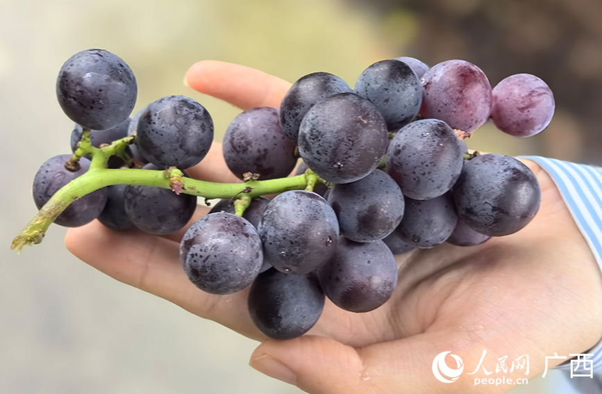 A tourist shows freshly harvested grapes in a grape planting base in Gucun village, Wushan township, Xingbin district, Laibin city, south China's Guangxi Zhuang Autonomous Region. (People's Daily Online/Fu Huazhou)