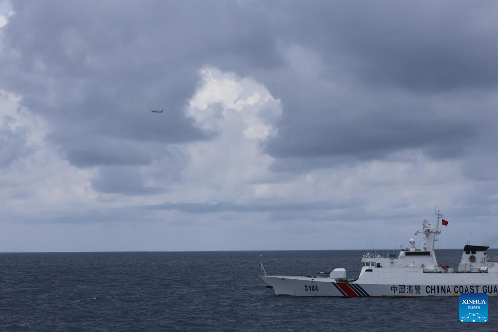 A P-8A Poseidon aircraft of the U.S. military interferes with the operations of rights protection and law enforcement of the China Coast Guard (CCG) in the lagoon of Xianbin Jiao of China's Nansha Qundao, Aug. 31, 2024. (Xinhua)