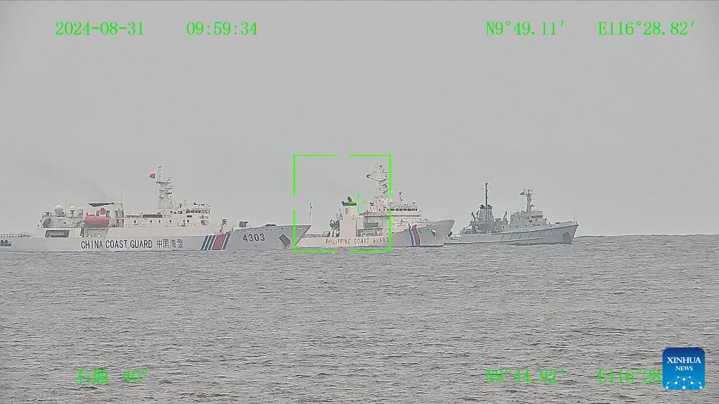 This image provided by the China Coast Guard (CCG) shows the Philippine vessel 9701 (C) and two CCG vessels in the lagoon of Xianbin Jiao of China's Nansha Qundao on Aug. 31, 2024. (Xinhua)