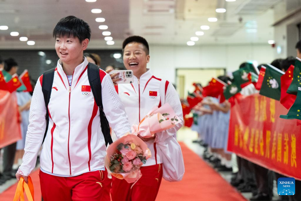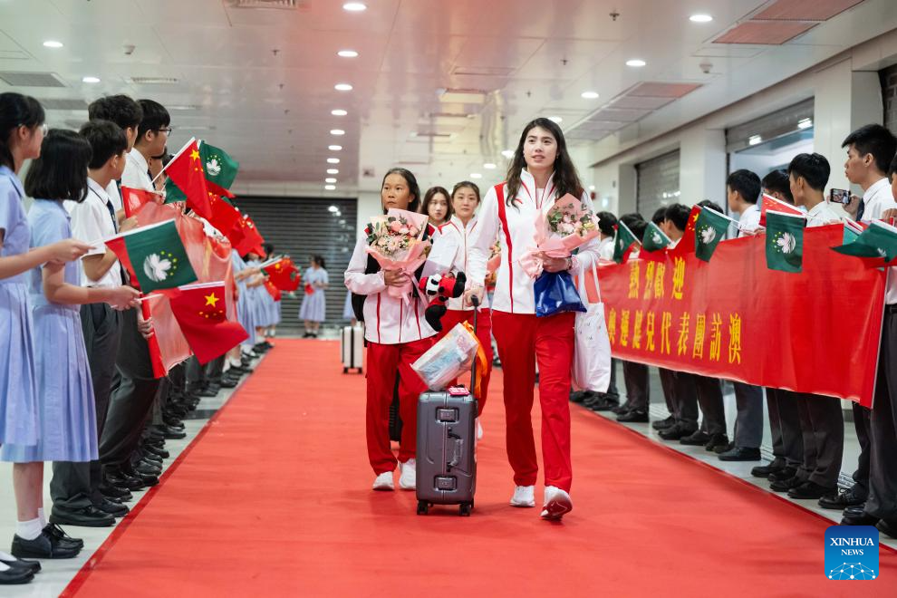 Chinese artistic swimmer Wang Ciyue (front) gestures during the welcome ceremony after arriving in Macao, south China, Aug. 31, 2024. A delegation of Chinese mainland Olympians from the Paris 2024 Olympic Games arrived in Macao on Saturday for a three-day visit. (Xinhua/Cheong Kam Ka)