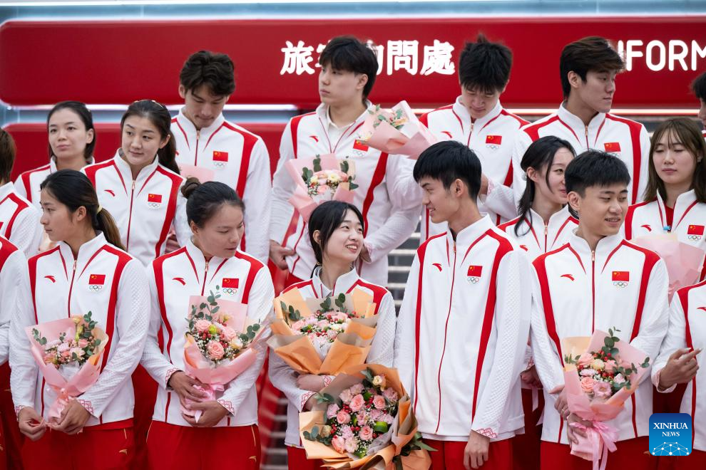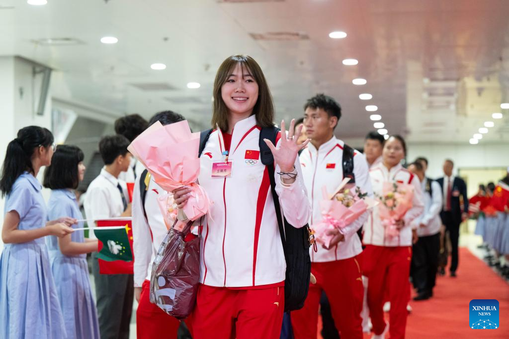 Chinese swimmer Zhang Yufei (front) attends the welcome ceremony after arriving in Macao, south China, Aug. 31, 2024. A delegation of Chinese mainland Olympians from the Paris 2024 Olympic Games arrived in Macao on Saturday for a three-day visit. (Xinhua/Cheong Kam Ka)