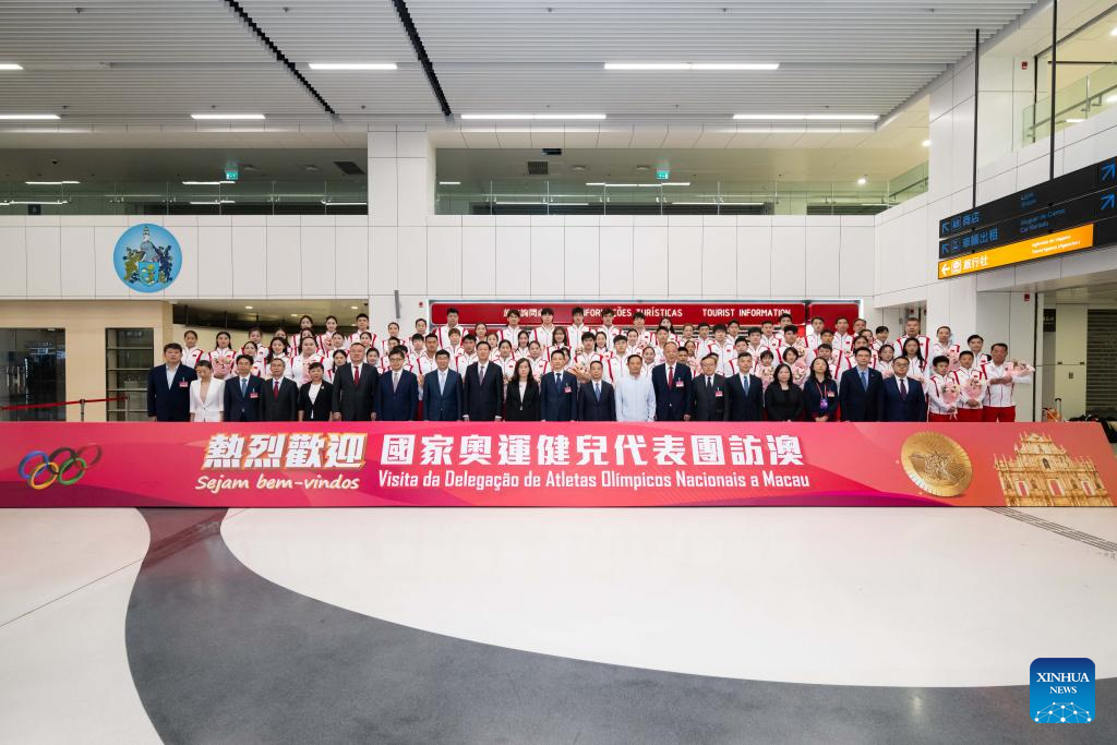 Members of the delegation of Chinese mainland Olympians from the Paris 2024 Olympic Games pose for photos during the welcome ceremony after arriving in Macao, south China, Aug. 31, 2024. A delegation of Chinese mainland Olympians from the Paris 2024 Olympic Games arrived in Macao on Saturday for a three-day visit. (Xinhua/Cheong Kam Ka)