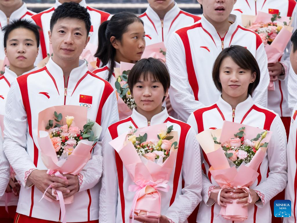 Chinese table tennis player Sun Yingsha (front) attends the welcome ceremony after arriving in Macao, south China, Aug. 31, 2024. A delegation of Chinese mainland Olympians from the Paris 2024 Olympic Games arrived in Macao on Saturday for a three-day visit. (Xinhua/Cheong Kam Ka)