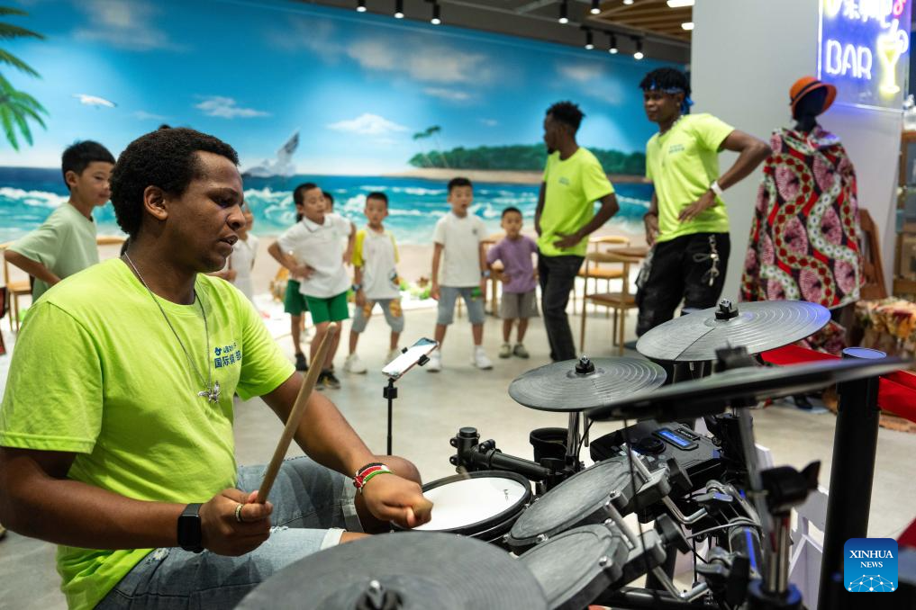 A volunteer demonstrates African music during a hands-on experience session at the Angola pavilion of a permanent exhibition hall of the China-Africa Economic and Trade Cooperation Promotion Innovation Demonstration Park in Changsha, central China's Hunan Province, Aug. 30, 2024. Various activities promoting youth communication between China and Africa were organized here during the summer vacation. With the help of African volunteers from local universities, Chinese students were able to feel the charm of African culture by learning traditional African dance, music, folk arts, and making immersive tours of African customs via VR devices. (Xinhua/Chen Sihan)