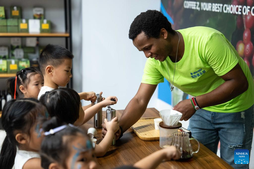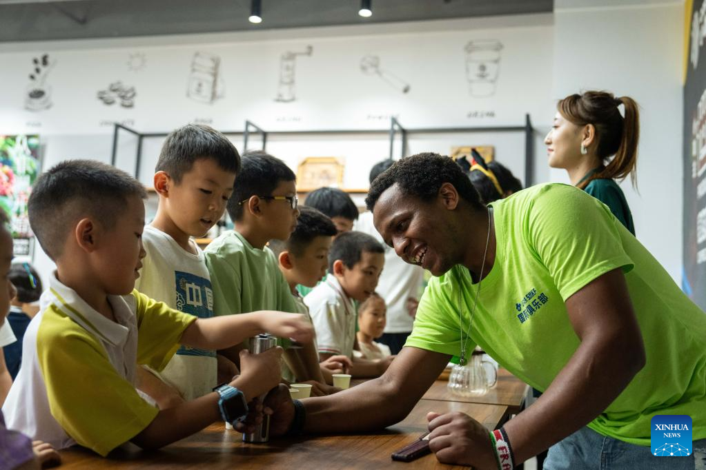 A volunteer grinds coffee beans with children during a hands-on experience session at the Ethiopia pavilion of a permanent exhibition hall of the China-Africa Economic and Trade Cooperation Promotion Innovation Demonstration Park in Changsha, central China's Hunan Province, Aug. 30, 2024. Various activities promoting youth communication between China and Africa were organized here during the summer vacation. With the help of African volunteers from local universities, Chinese students were able to feel the charm of African culture by learning traditional African dance, music, folk arts, and making immersive tours of African customs via VR devices. (Xinhua/Chen Sihan)