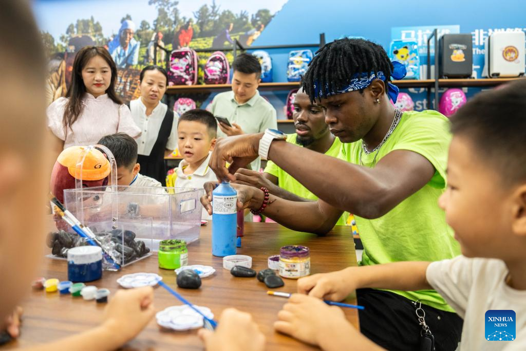 Volunteers introduce stone painting to children during a hands-on experience session at the Malawi pavilion of a permanent exhibition hall of the China-Africa Economic and Trade Cooperation Promotion Innovation Demonstration Park in Changsha, central China's Hunan Province, Aug. 30, 2024. Various activities promoting youth communication between China and Africa were organized here during the summer vacation. With the help of African volunteers from local universities, Chinese students were able to feel the charm of African culture by learning traditional African dance, music, folk arts, and making immersive tours of African customs via VR devices. (Xinhua/Chen Sihan)