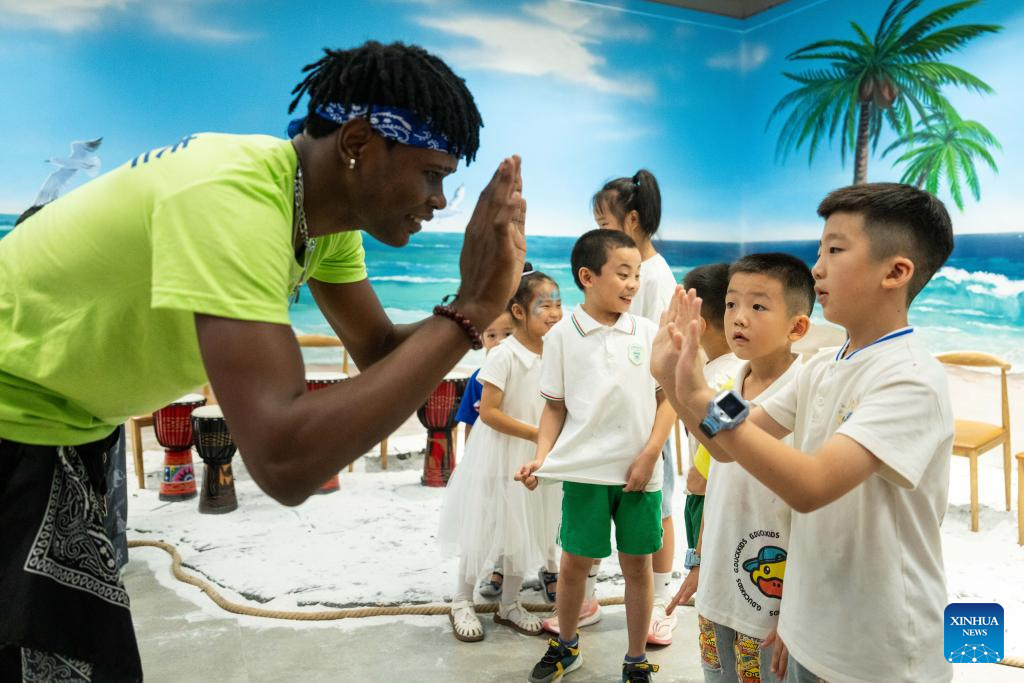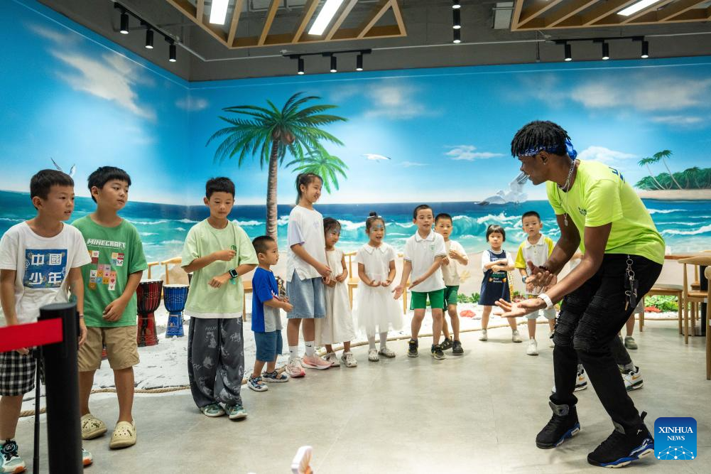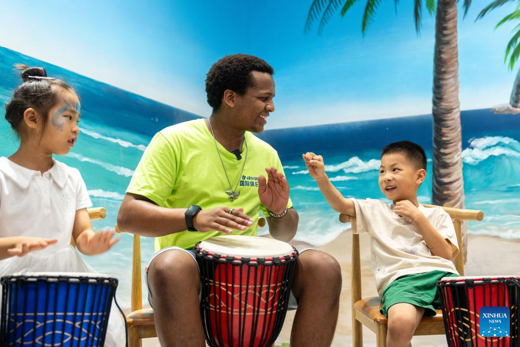 A volunteer plays African drum with children during a hands-on experience session at the Angola pavilion of a permanent exhibition hall of the China-Africa Economic and Trade Cooperation Promotion Innovation Demonstration Park in Changsha, central China's Hunan Province, Aug. 30, 2024. Various activities promoting youth communication between China and Africa were organized here during the summer vacation. With the help of African volunteers from local universities, Chinese students were able to feel the charm of African culture by learning traditional African dance, music, folk arts, and making immersive tours of African customs via VR devices. (Xinhua/Chen Sihan)