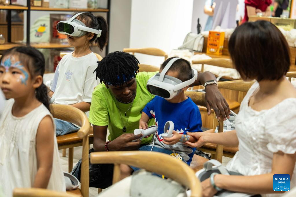 A volunteer helps a kid to put on VR device during a hands-on experience session at the Mali pavilion of a permanent exhibition hall of the China-Africa Economic and Trade Cooperation Promotion Innovation Demonstration Park in Changsha, central China's Hunan Province, Aug. 30, 2024. Various activities promoting youth communication between China and Africa were organized here during the summer vacation. With the help of African volunteers from local universities, Chinese students were able to feel the charm of African culture by learning traditional African dance, music, folk arts, and making immersive tours of African customs via VR devices. (Xinhua/Chen Sihan)
