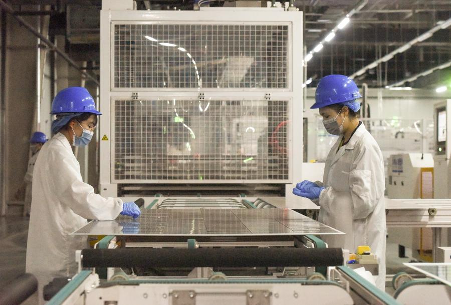 Female employees operate at a workshop of Xinjiang Middle Hoshine Silicon Industry in the suburb of Urumqi, northwest China's Xinjiang Uygur Autonomous Region, Aug. 29, 2024. (Xinhua/Gao Han)