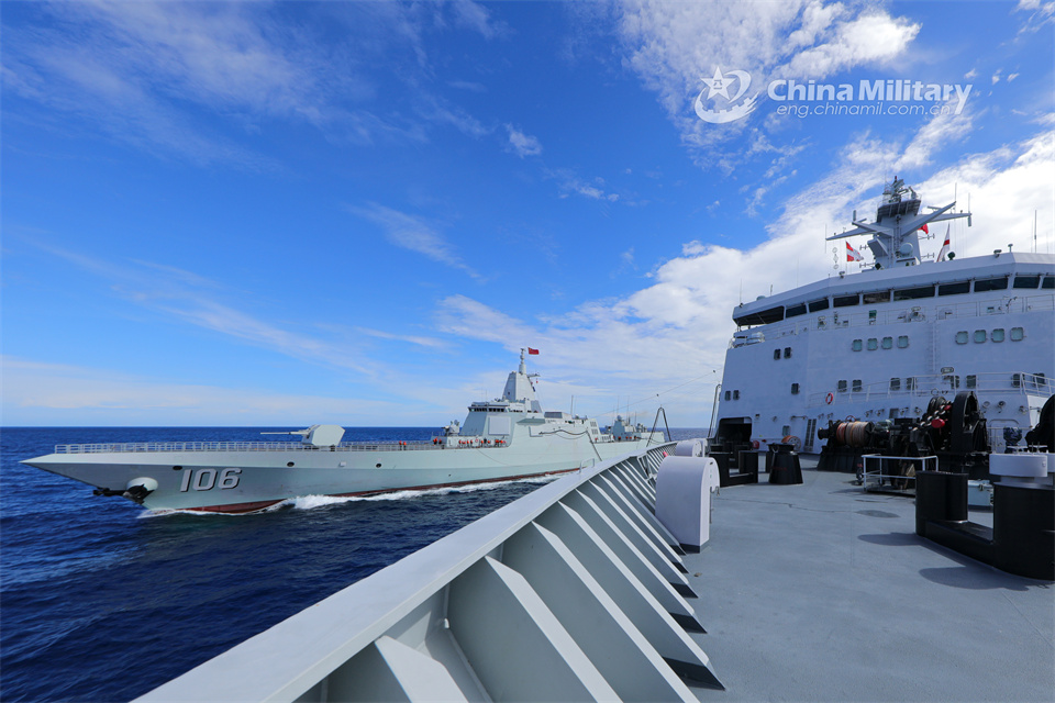 The comprehensive supply ship Chaganhu (Hull 967) and the Type 055 guided-missile destroyer Yan'an (Hull 106) attached to a unit with the navy under the PLA Southern Theater Command conduct alongside replenishment-at-sea during a maritime training exercise on July 25, 2024. (eng.chinamil.com.cn/Photo by Peng Jun)