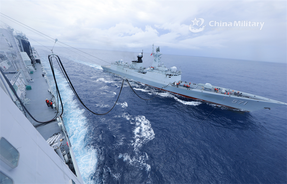 The comprehensive supply ship Chaganhu (Hull 967) and the guided-missile frigate Yuncheng (Hull 571) attached to a unit with the navy under the PLA Southern Theater Command conduct alongside replenishment-at-sea during a maritime training exercise on July 25, 2024. (eng.chinamil.com.cn/Photo by Peng Jun)