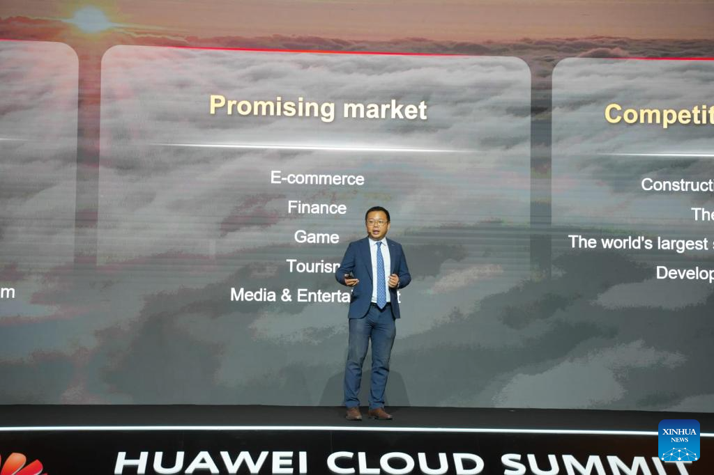 Alan Qi, president of Huawei Cloud Middle East and Central Asia, speaks at the Huawei Cloud Summit Saudi Arabia 2024 in Riyadh, Saudi Arabia, on Sept. 2, 2024. China's technology giant Huawei on Monday announced several artificial intelligence (AI) initiatives to facilitate Saudi Arabia's digital transformation and support its government program Saudi Vision 2030. (Huawei/Handout via Xinhua)