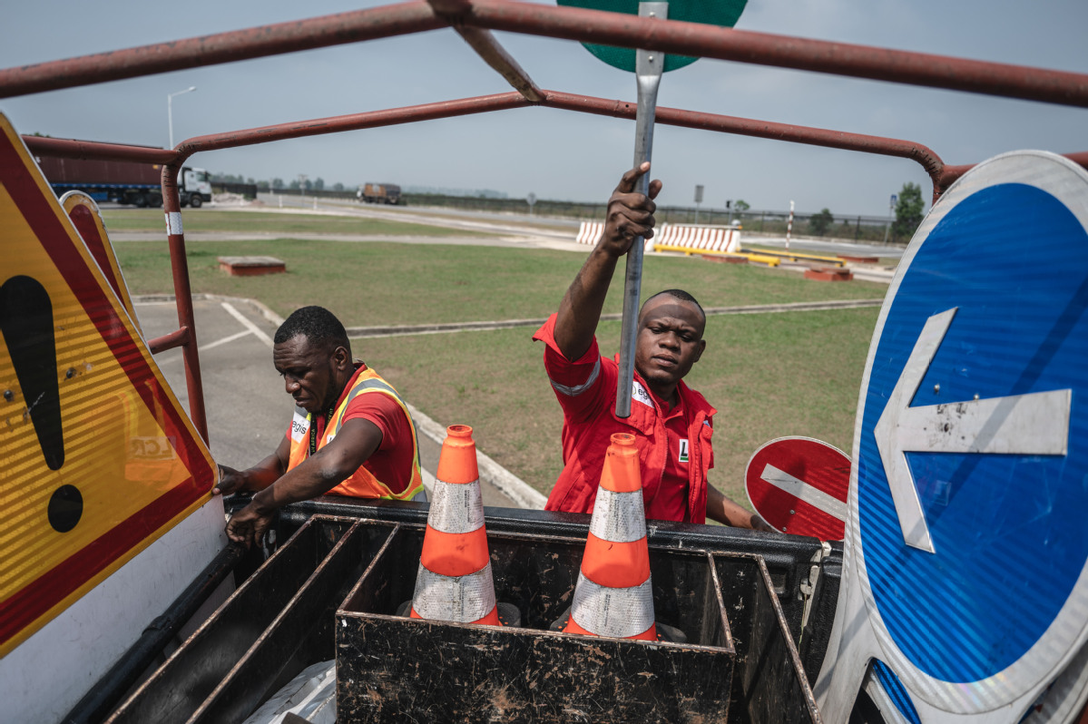 Highway patrol officers organize equipment at a toll station on the No 1 National Highway in the Republic of Congo on July 31. The 536-kilometer highway, constructed by China State Construction Engineering Corporation, links the capital city of Brazzaville with the Atlantic port of Pointe-Noire. WANG GUANSEN/XINHUA
