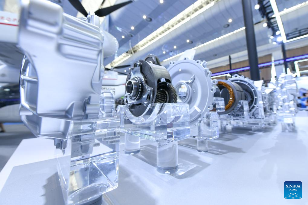 This photo taken on Sept. 1, 2024 shows a dual-motor drive system for the new energy vehicle (NEV) in Yibin, southwest China's Sichuan Province. (Xinhua/Tang Wenhao)