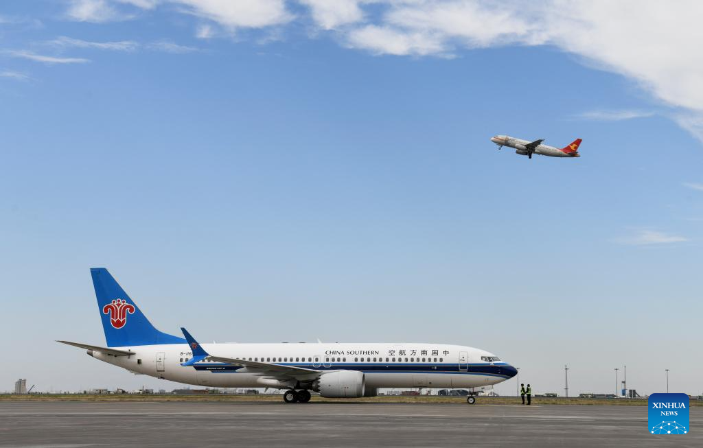 Flight CZ5091 of China Southern Airlines, which is bound for Yerevan of Armenia, is pictured at Urumqi Diwopu International Airport in Urumqi, northwest China's Xinjiang Uygur Autonomous Region, Sept. 3, 2024. (Xinhua/Wang Fei)