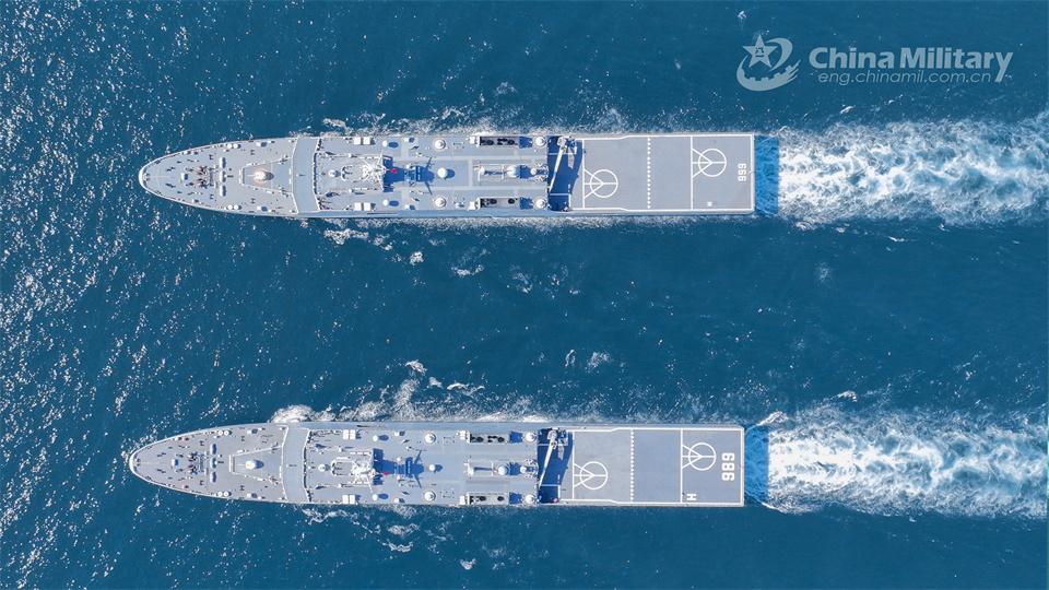 The amphibious dock landing ship Changbaishan (Hull 989) and Jinggangshan (Hull 999) attached to a landing ship flotilla with the navy under the Chinese PLA Southern Theater Command sail in formation en route to the designated waters in the South China Sea during a maritime training exercise on August 3, 2024. (eng.chinamil.com.cn/Photo by Qiao Chenxi)