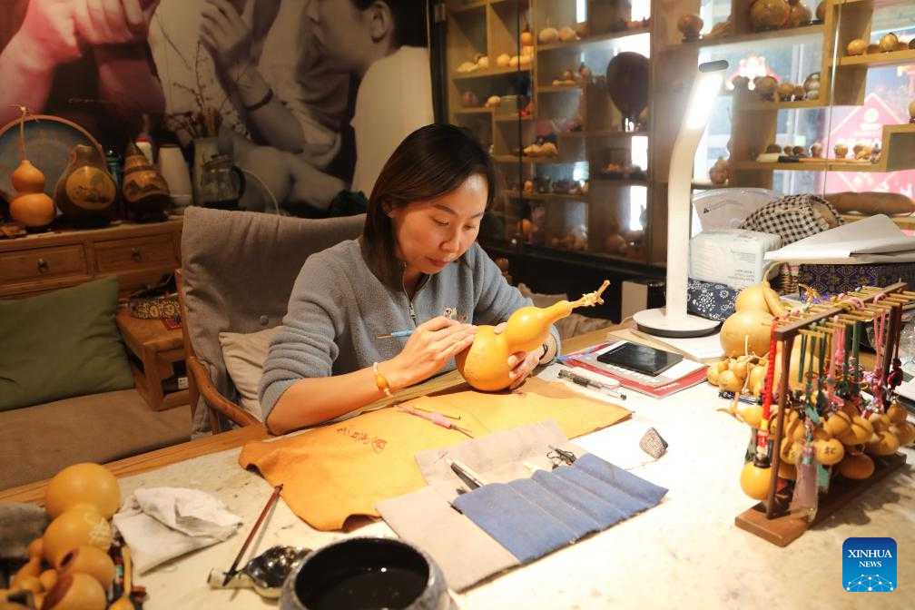 Ruan Xiyue, an artisan of Lanzhou gourd carving, carves a gourd at a studio in Lanzhou, northwest China's Gansu Province, May 11, 2024.(Xinhua/Ma Sha)