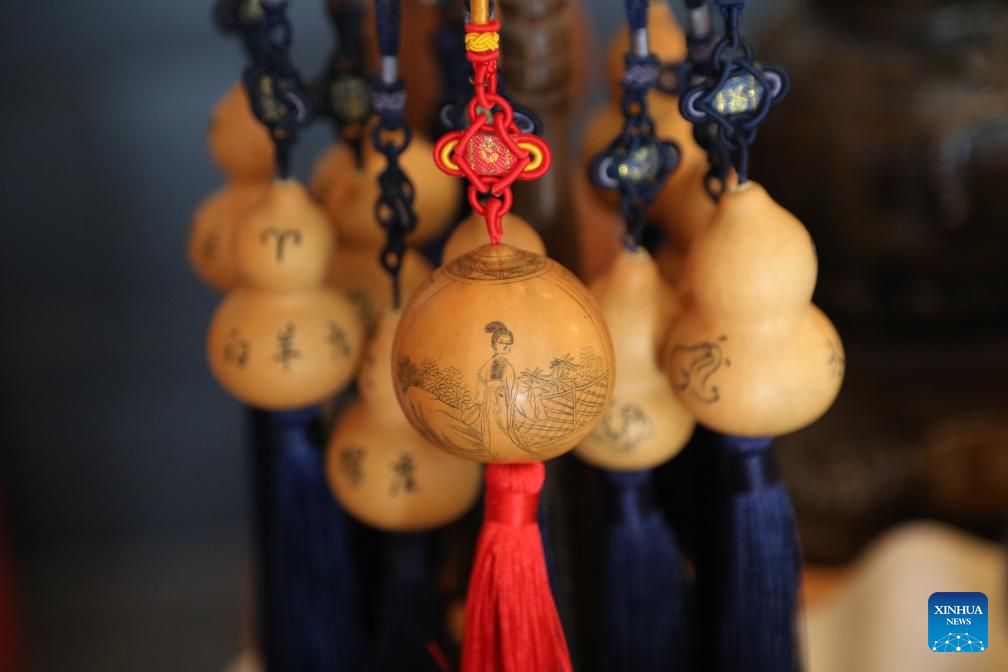 Lanzhou gourd carving works are pictured at a studio in Lanzhou, northwest China's Gansu Province, May 11, 2024.(Xinhua/Ma Sha)