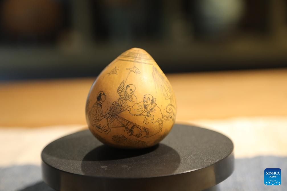 A Lanzhou gourd carving work is pictured at a studio in Lanzhou, northwest China's Gansu Province, May 11, 2024.(Xinhua/Ma Sha)
