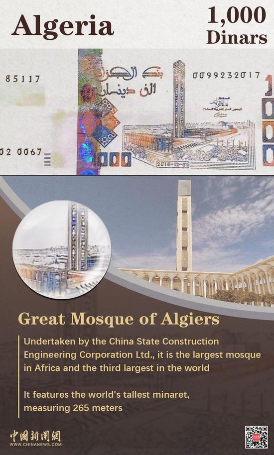 Located in the central axis of Algiers Bay, the Grand Mosque of Algeria is the largest mosque in Africa and the third largest in the world. Its grandeur is even more obvious from the 1,000 Algerian Dinar banknote. Undertaken by the China State Construction Engineering Corporation Ltd., it features the world's tallest minaret, measuring 265 meters.
